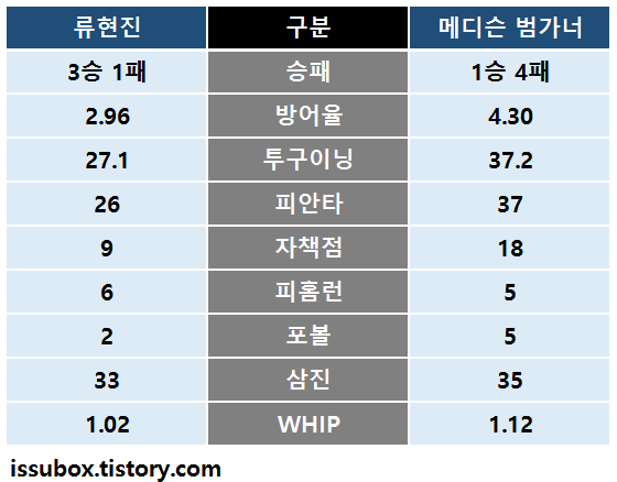 [류현진 vs 범가너 성적 비교]