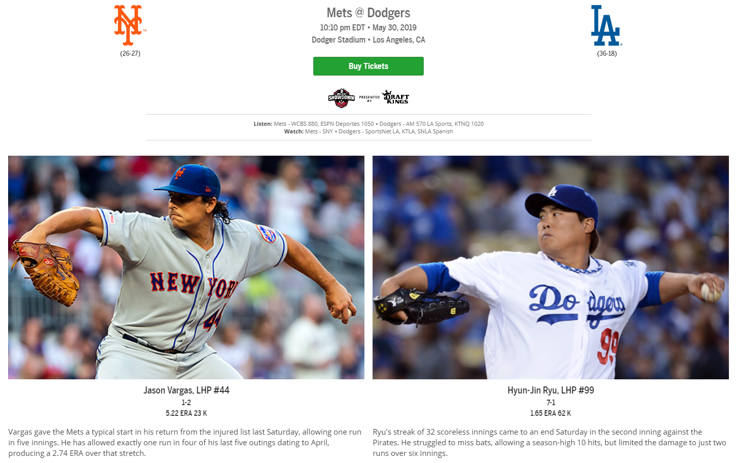 류현진 선수의 다음 경기 일정이 5월 31일 오전 11시 10분(한국시간) 뉴욕 메츠와의 경기로 확정되었습니다. 상대 투수는 현지 1승 2패 방어율 5.22의 제이슨 바르사스 선수로 확정되었는데요. LA다저스 홈에서의 승부입니다.