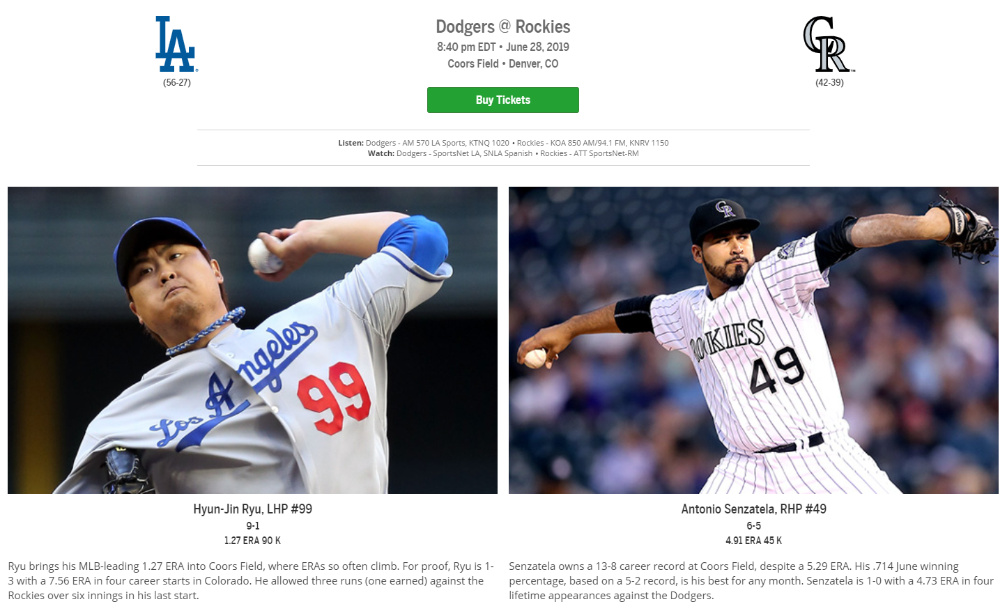 류현진의 등판 일정과 상대가 6월 29일 오전 9시 40분(한국시간) 콜로라도 원정 쿠어스필드에서 안토니오 센자텔라와의 경기로 확정되었습니다.