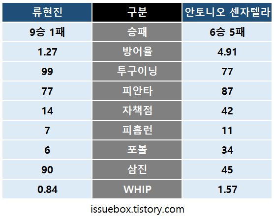 류현진 vs 안토니오 센자텔라 성적 비교류현진 vs 안토니오 센자텔라 성적 비교