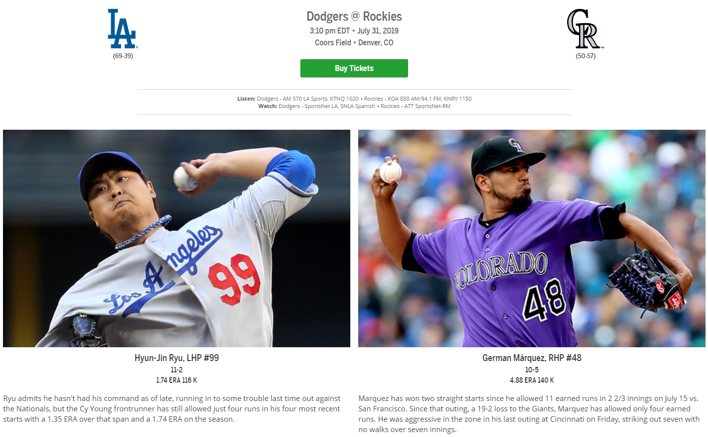 사전에 미리 예고했던 대로 류현진의 다음 등판일정은 8월 1일 새벽 4시 10분(한국시간) 콜로라도 원정으로 결정되었습니다. 지난 6월 등판에서 4이닝 7실점을 안겨준 그 콜로라도의 쿠어스 필드에서의 선발등판인데 상대투수 또한 헤르만 마르케즈로 만만치 않은 선수로 결정되었네요.