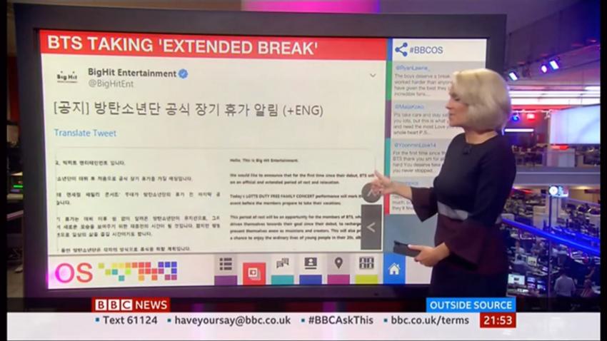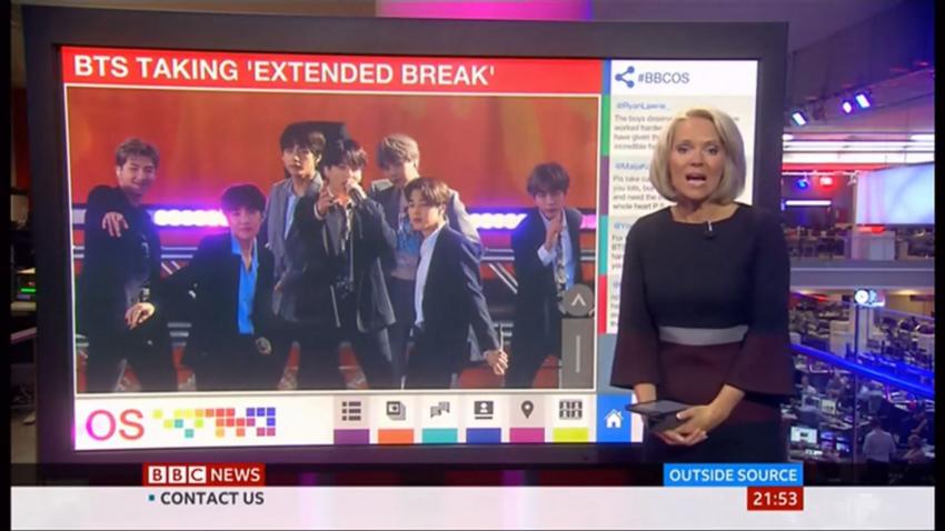 BBC 9시 뉴스에 방탄소년단이 장기휴가 떠나는게 보도될 줄이야 ㅋㅋㅋ