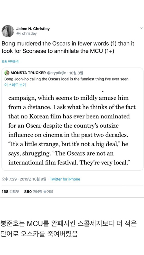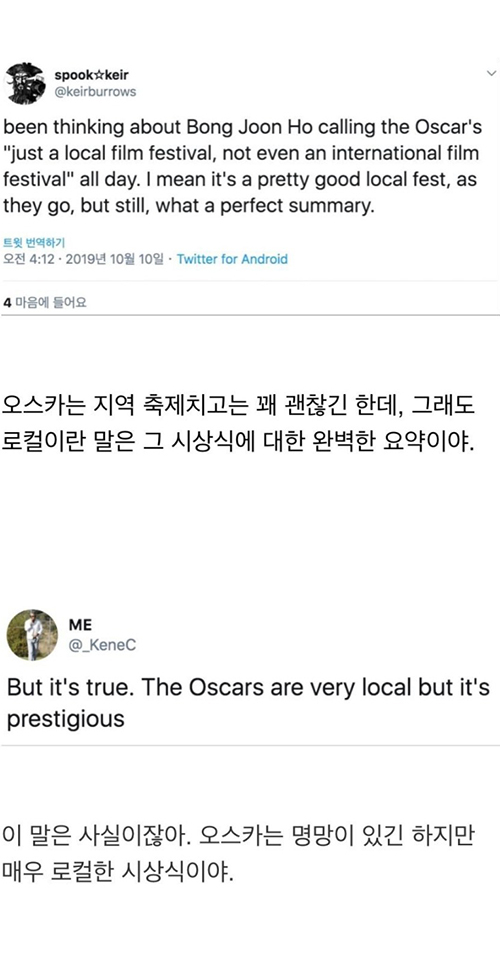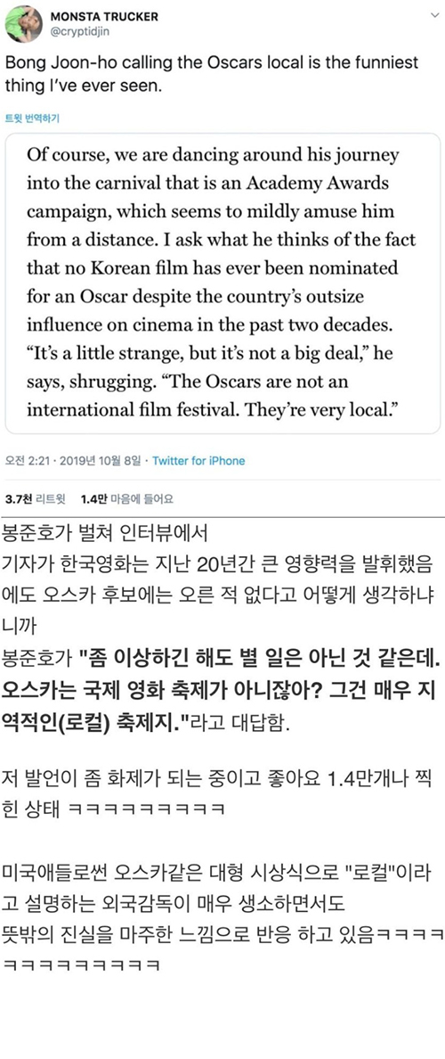 봉준호 감독이 한 언론과의 인터뷰에서 오스카상(아카데미상)에 대해 "좀 이상하긴 해도 별 일은 아닌 것 같은데. 오스카는 국제 영화 축제가 아니잖아? 그건 매우 지역적인(로컬) 축제지."라고 한 발언에 대한 외국인들의 반응을 모아놓은 글이 있어 공유합니다.