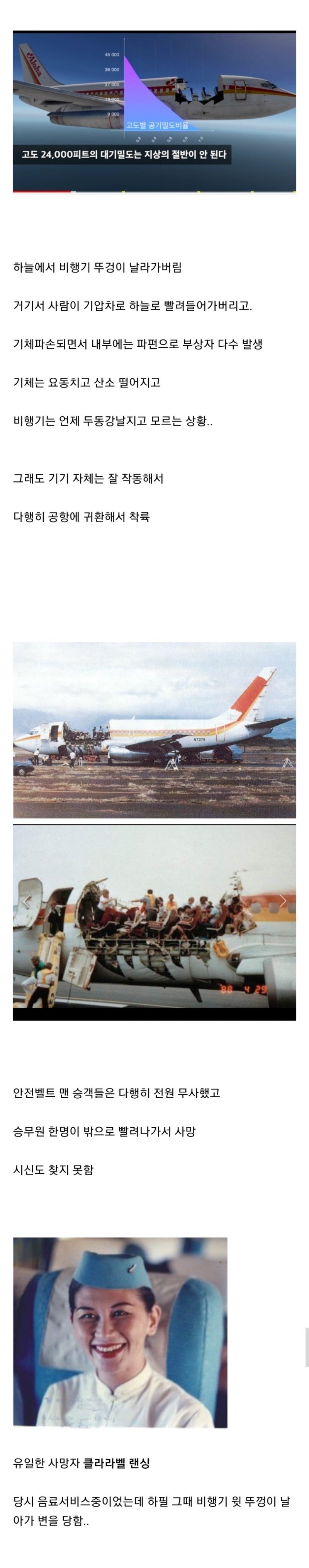 비행기를 탈 때 안전벨트를 매야 하는 이유를 요약하면, 항공기 기체에 파손이 발생될 경우 기압차로 인하여 사람이 빨려나갈 수 있다고 합니다. 위에서 적은 건 그게 현실로 일어난 것이고... 비행기 기체 뚜껑이 날라가도 전원 무사하다니 대단하네요.