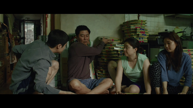 기생충 영화 속에서 피자박스 접는 장면을 보는 씬입니다.