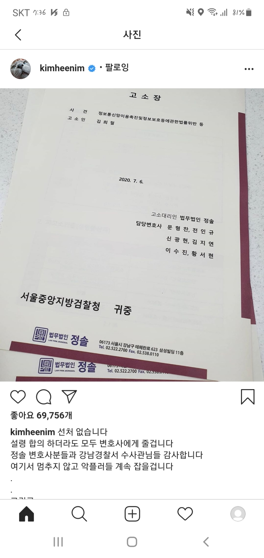 그리고 어제, 본인의 SNS에 고소장 사진을 찍어 올리며 본인이 말했던 고소를 실행하고 있음을 인증했습니다.