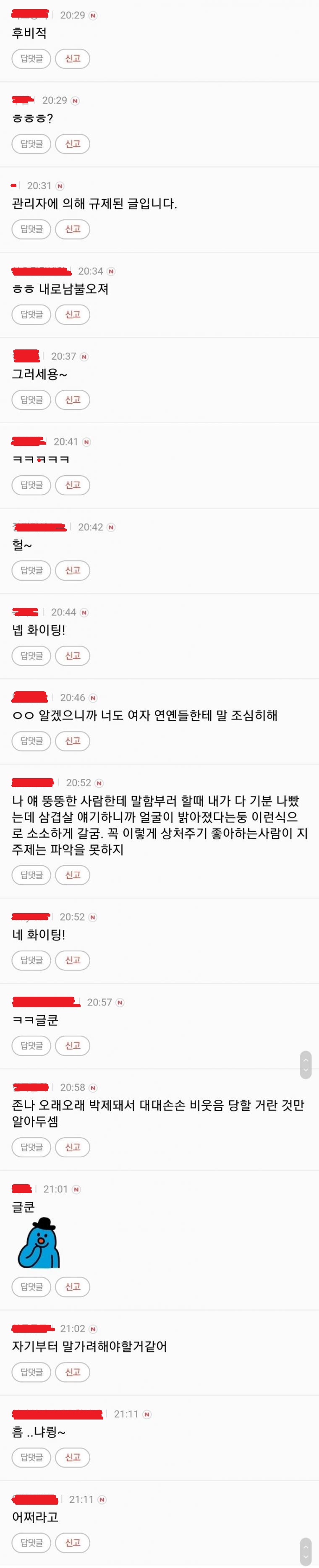 평소와 같이 막말은 하고 싶지만, 고소당할까봐 조심조심 비아냥 대는게 느껴지는 댓글들이네요..^^