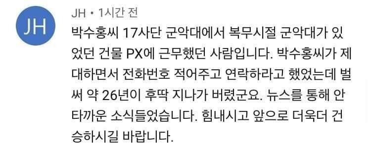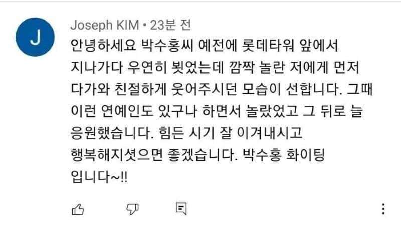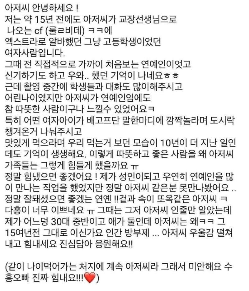 한 CF에 엑스트라로 출연했던 여자분도 글을 남겼네요. '이렇게 따뜻하고 좋은 사람을 왜 아저씨 가족들은 그렇게 힘들게 했을까요ㅠ'라며 위로와 함께 박수홍씨의 따뜻함을 기억하고 있습니다.