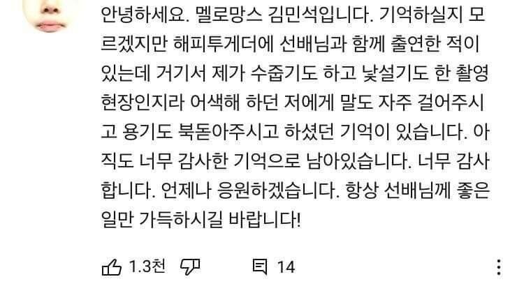 가수 멜로망스의 김민석도 낮선 촬영장에서 말도 걸어주고 어색함을 풀어주었던 좋은 기억을 공유했습니다.