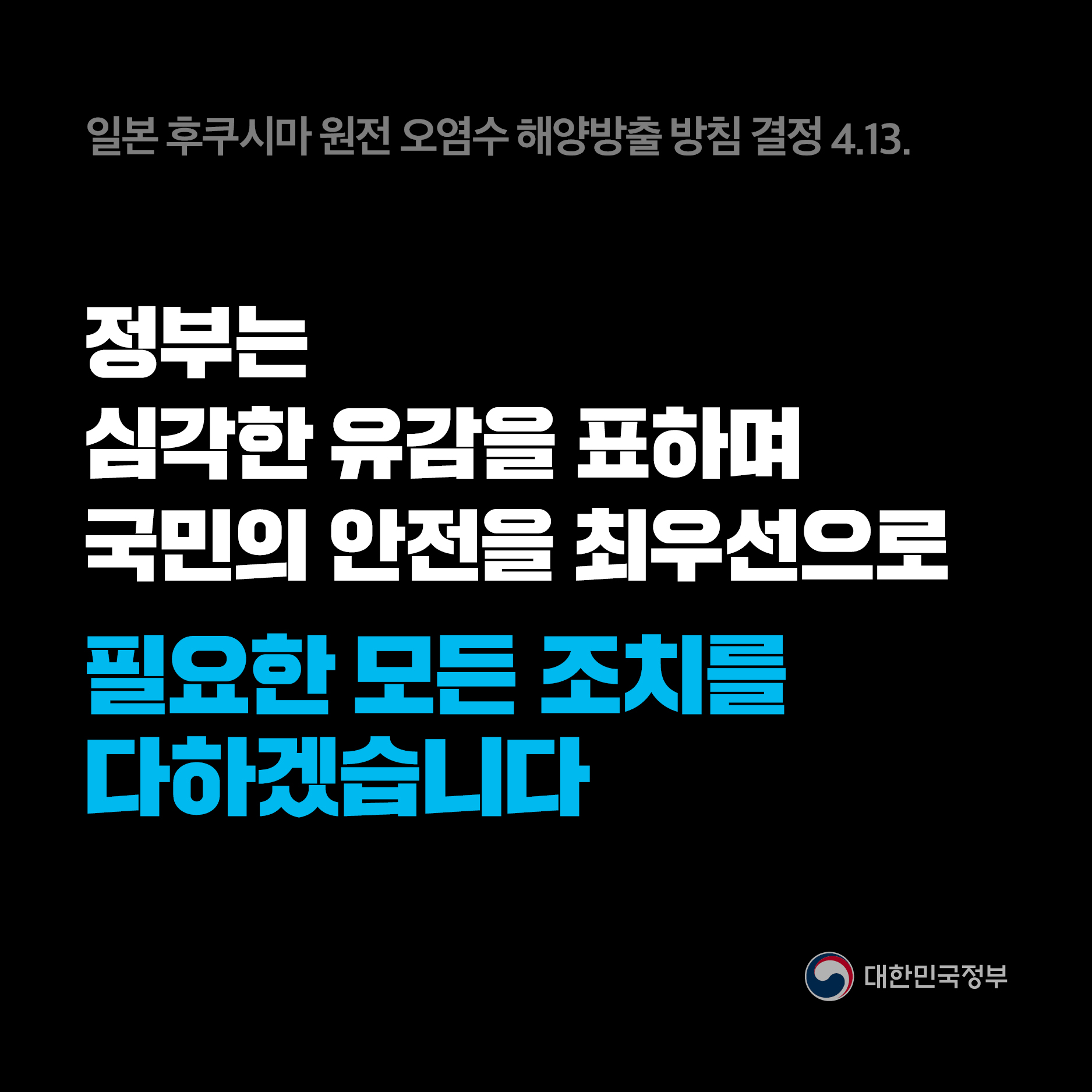 상황이 이렇게 심각하다보니 정부에서도 긴급하게 "원전 오염수 처분 문제데 대해 국제사회의 관심을 환기하고 공동대응할 수 있을 방법을 모색해 왔다"며 "필요한 모든 조치를 다 하겠다"고 유감표명을 했습니다.