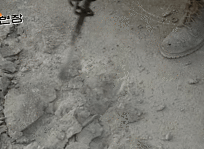 콘크리트를 부수는 장면입니다. 전문가 분들은 한 군데를 잘 부수던데 이병헌은 자리를 잡지 못하고 콩콩을 타듯이 여기저기 튀어다니며 바닥을 깨지 못합니다.