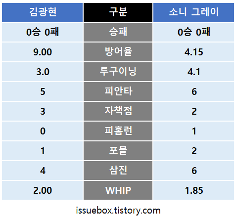 두 선수 모두 이제 한 경기를 치른 상황이라 성적비교가 의미가 있겠냐마는 그냥 둘을 비교한다는 생각으로 김광현과 소니 그레이의 성적을 비교해보겠습니다. 그냥 지난경기 성적으로 보시면 되겠습니다.
